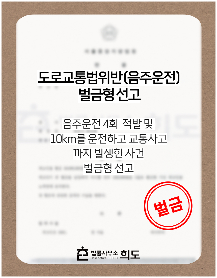 비록 위험운전치상 혐의는 배제되었으나, 의뢰인은 4회째 음주운전으로 적발된 상황이었기에 결코 가볍게 볼 수 없는 사안이었습니다. 이에 변호인은 의뢰인의 구체적인 생활 환경과 사건 전후의 정황, 재범 위험성에 대한 판단 요소 등을 중심으로 본 사건이 다른 음주운전 사건들과는 달리 평가되어야 할 사정이 있음을 상세히 변론하였습니다. 그 결과 법원은 이를 참작하여 벌금형이라는 비교적 관대한 처벌을 선고하였습니다.